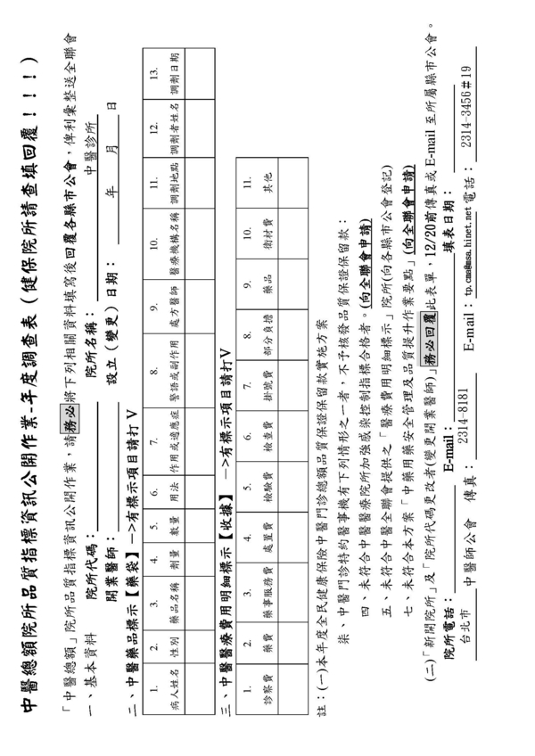 | 台北市中醫師公會 官網:http://www.tpcma.org.tw 地址:台北市中正區青島西路11號3樓 E-mail:tp.cma@msa.hinet.net 電話:(02)2314-3456(代表號) 傳真:(02)2314-8181 |