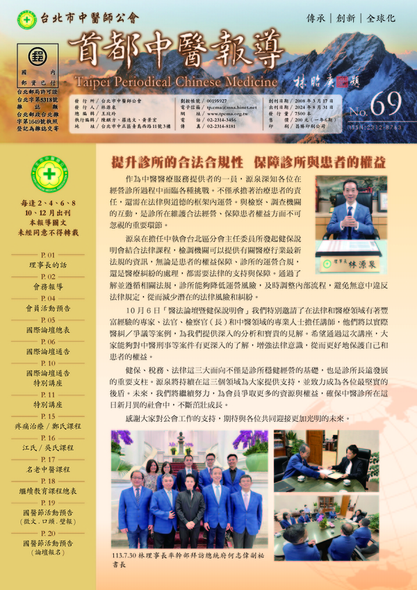| 台北市中醫師公會 官網:http://www.tpcma.org.tw 地址:台北市中正區青島西路11號3樓 E-mail:tp.cma@msa.hinet.net 電話:(02)2314-3456(代表號) 傳真:(02)2314-8181 |