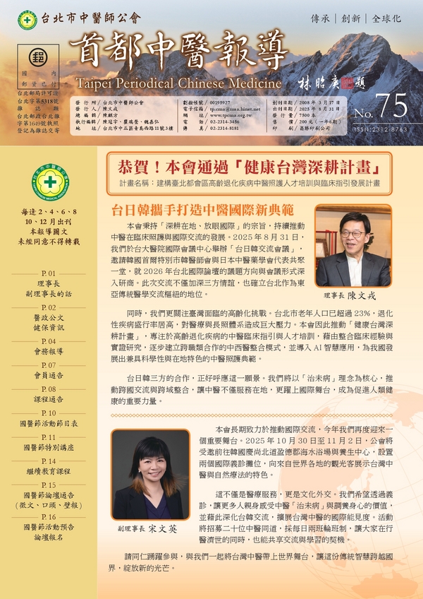 | 台北市中醫師公會 官網:http://www.tpcma.org.tw 地址:台北市中正區青島西路11號3樓 E-mail:tp.cma@msa.hinet.net 電話:(02)2314-3456(代表號) 傳真:(02)2314-8181 |