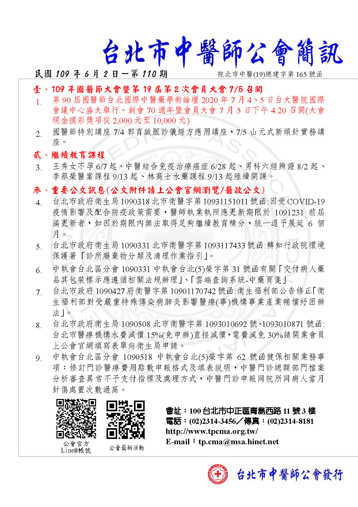 | 台北市中醫師公會 官網:http://www.tpcma.org.tw 地址:台北市中正區青島西路11號3樓 E-mail:tp.cma@msa.hinet.net 電話:(02)2314-3456(代表號) 傳真:(02)2314-8181 |