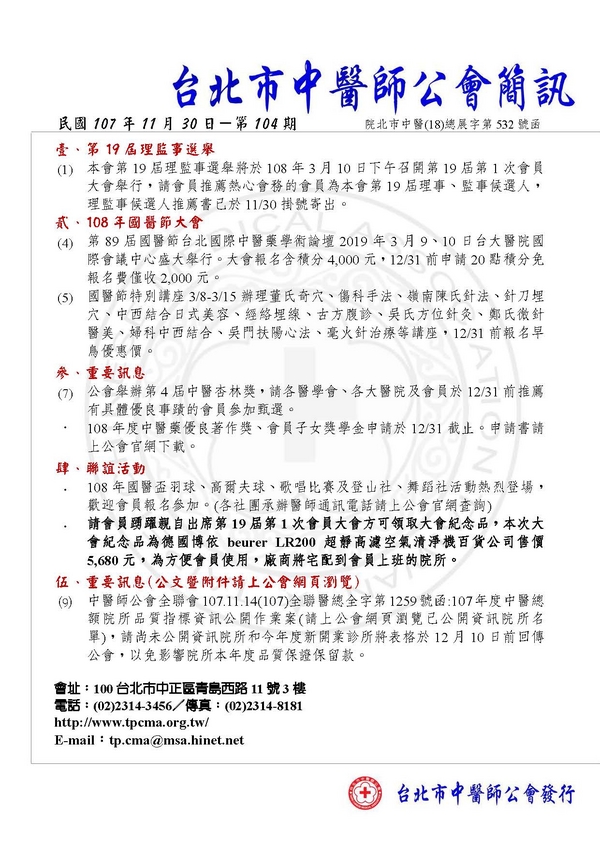 | 台北市中醫師公會 官網:http://www.tpcma.org.tw 地址:台北市中正區青島西路11號3樓 E-mail:tp.cma@msa.hinet.net 電話:(02)2314-3456(代表號) 傳真:(02)2314-8181 |