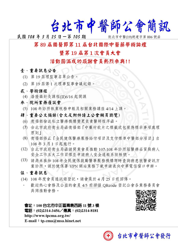 | 台北市中醫師公會 官網:http://www.tpcma.org.tw 地址:台北市中正區青島西路11號3樓 E-mail:tp.cma@msa.hinet.net 電話:(02)2314-3456(代表號) 傳真:(02)2314-8181 |