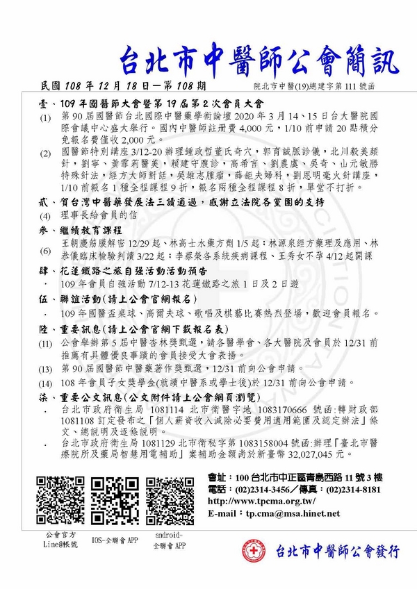 | 台北市中醫師公會 官網:http://www.tpcma.org.tw 地址:台北市中正區青島西路11號3樓 E-mail:tp.cma@msa.hinet.net 電話:(02)2314-3456(代表號) 傳真:(02)2314-8181 |