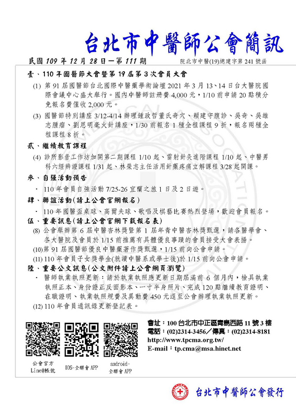 | 台北市中醫師公會 官網:http://www.tpcma.org.tw 地址:台北市中正區青島西路11號3樓 E-mail:tp.cma@msa.hinet.net 電話:(02)2314-3456(代表號) 傳真:(02)2314-8181 |
