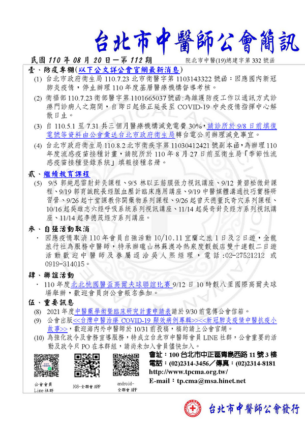 | 台北市中醫師公會 官網:http://www.tpcma.org.tw 地址:台北市中正區青島西路11號3樓 E-mail:tp.cma@msa.hinet.net 電話:(02)2314-3456(代表號) 傳真:(02)2314-8181 |