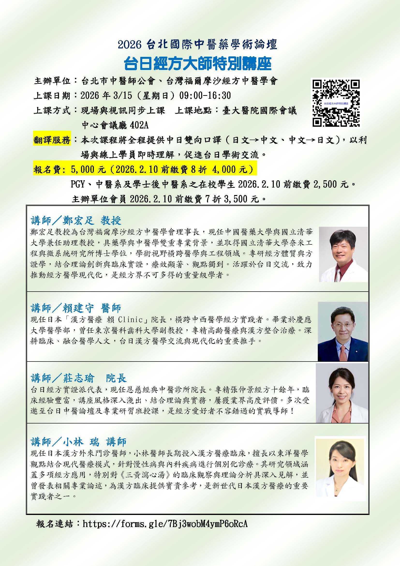 | 台北市中醫師公會 官網:http://www.tpcma.org.tw 地址:台北市中正區青島西路11號3樓 E-mail:tp.cma@msa.hinet.net 電話:(02)2314-3456(代表號) 傳真:(02)2314-8181 |
