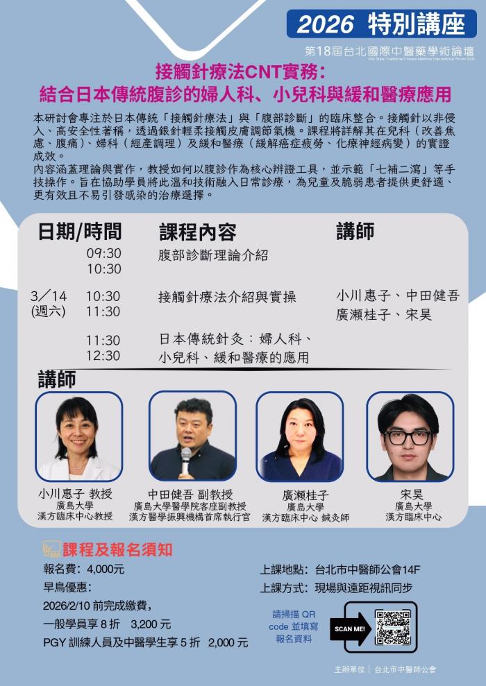 | 台北市中醫師公會 官網:http://www.tpcma.org.tw 地址:台北市中正區青島西路11號3樓 E-mail:tp.cma@msa.hinet.net 電話:(02)2314-3456(代表號) 傳真:(02)2314-8181 |