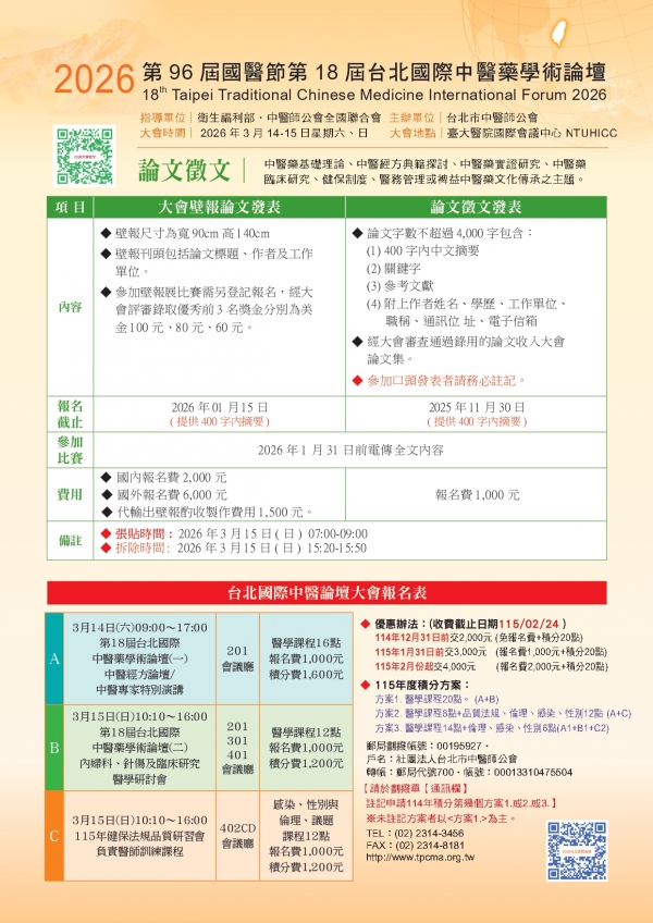 | 台北市中醫師公會 官網:http://www.tpcma.org.tw 地址:台北市中正區青島西路11號3樓 E-mail:tp.cma@msa.hinet.net 電話:(02)2314-3456(代表號) 傳真:(02)2314-8181 |