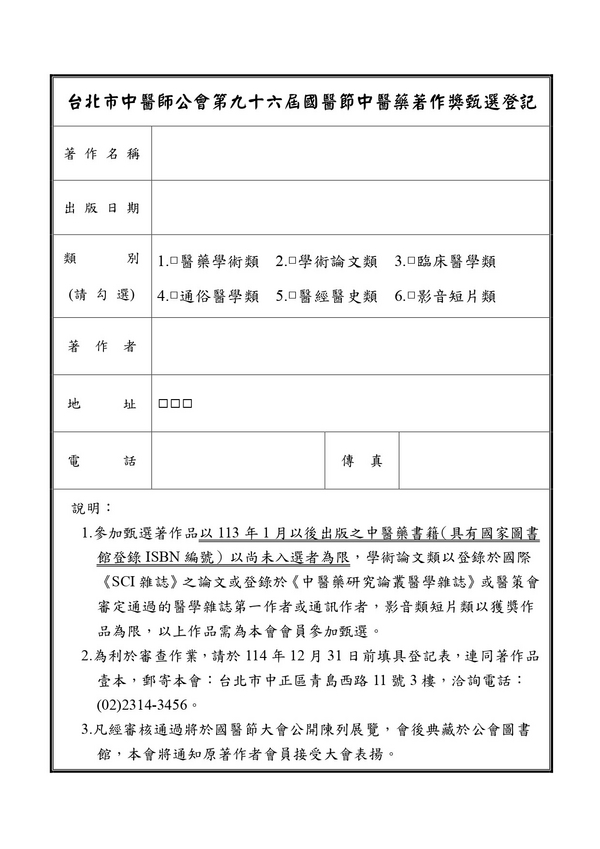 | 台北市中醫師公會 官網:http://www.tpcma.org.tw 地址:台北市中正區青島西路11號3樓 E-mail:tp.cma@msa.hinet.net 電話:(02)2314-3456(代表號) 傳真:(02)2314-8181 |