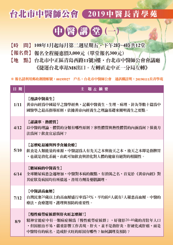 | 台北市中醫師公會 官網:http://www.tpcma.org.tw 地址:台北市中正區青島西路11號3樓 E-mail:tp.cma@msa.hinet.net 電話:(02)2314-3456(代表號) 傳真:(02)2314-8181 |