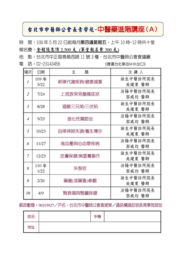 | 台北市中醫師公會 官網:http://www.tpcma.org.tw 地址:台北市中正區青島西路11號3樓 E-mail:tp.cma@msa.hinet.net 電話:(02)2314-3456(代表號) 傳真:(02)2314-8181 |