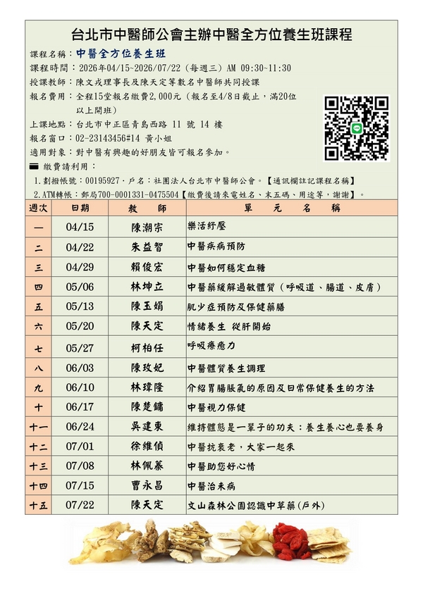 | 台北市中醫師公會 官網:http://www.tpcma.org.tw 地址:台北市中正區青島西路11號3樓 E-mail:tp.cma@msa.hinet.net 電話:(02)2314-3456(代表號) 傳真:(02)2314-8181 |
