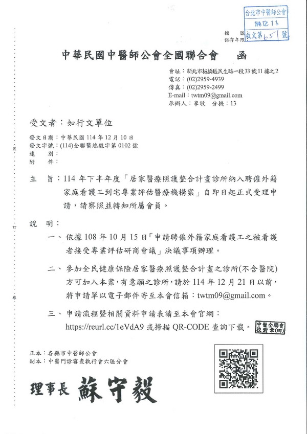 | 台北市中醫師公會 官網:http://www.tpcma.org.tw 地址:台北市中正區青島西路11號3樓 E-mail:tp.cma@msa.hinet.net 電話:(02)2314-3456(代表號) 傳真:(02)2314-8181 |