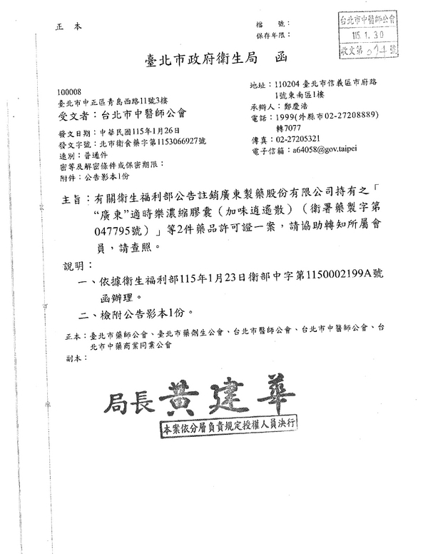 | 台北市中醫師公會 官網:http://www.tpcma.org.tw 地址:台北市中正區青島西路11號3樓 E-mail:tp.cma@msa.hinet.net 電話:(02)2314-3456(代表號) 傳真:(02)2314-8181 |