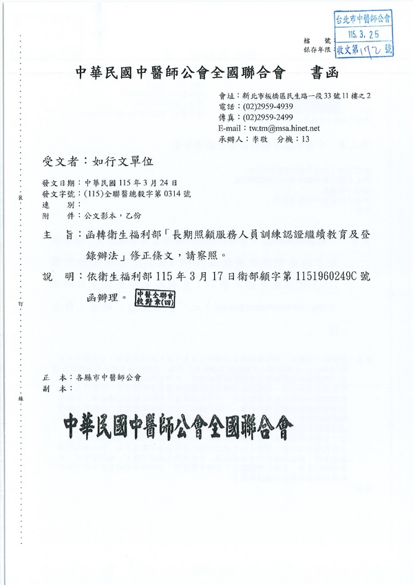 | 台北市中醫師公會 官網:http://www.tpcma.org.tw 地址:台北市中正區青島西路11號3樓 E-mail:tp.cma@msa.hinet.net 電話:(02)2314-3456(代表號) 傳真:(02)2314-8181 |