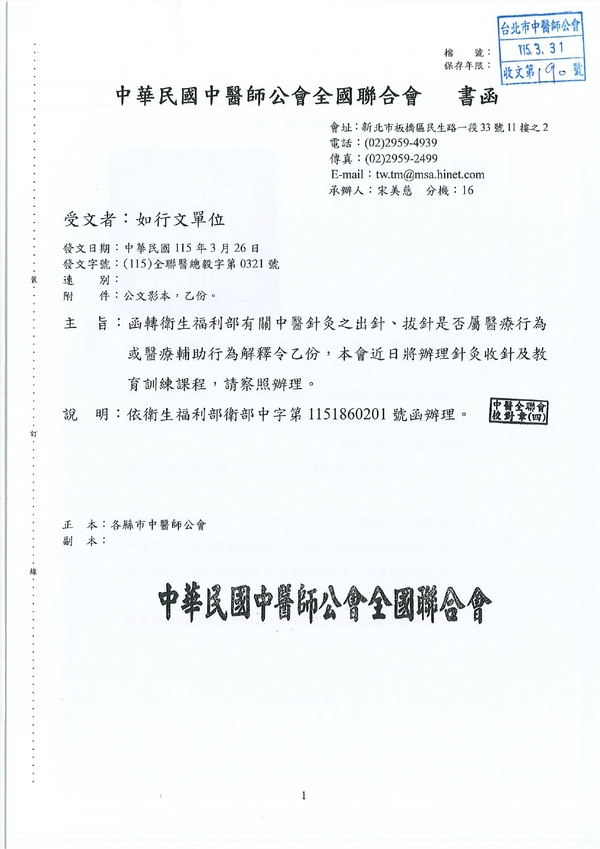 | 台北市中醫師公會 官網:http://www.tpcma.org.tw 地址:台北市中正區青島西路11號3樓 E-mail:tp.cma@msa.hinet.net 電話:(02)2314-3456(代表號) 傳真:(02)2314-8181 |