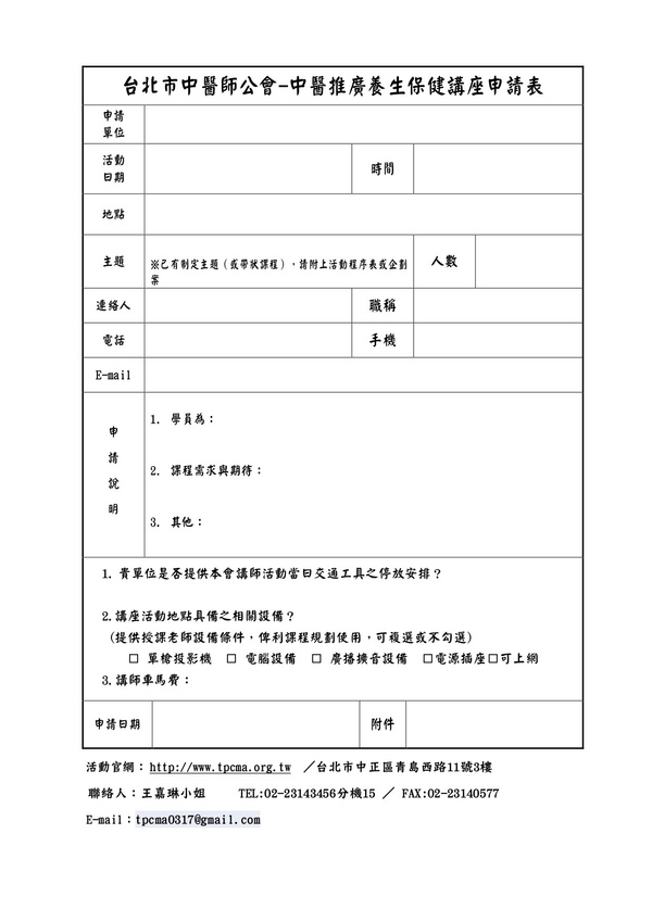 | 台北市中醫師公會 官網:http://www.tpcma.org.tw 地址:台北市中正區青島西路11號3樓 E-mail:tp.cma@msa.hinet.net 電話:(02)2314-3456(代表號) 傳真:(02)2314-8181 |