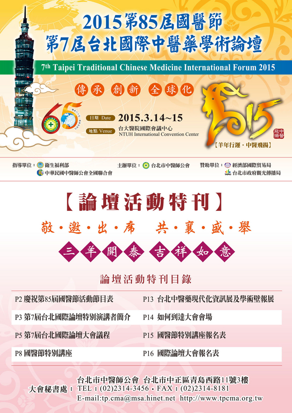 | 台北市中醫師公會 官網:http://www.tpcma.org.tw 地址:台北市中正區青島西路11號3樓 E-mail:tp.cma@msa.hinet.net 電話:(02)2314-3456(代表號) 傳真:(02)2314-8181 |