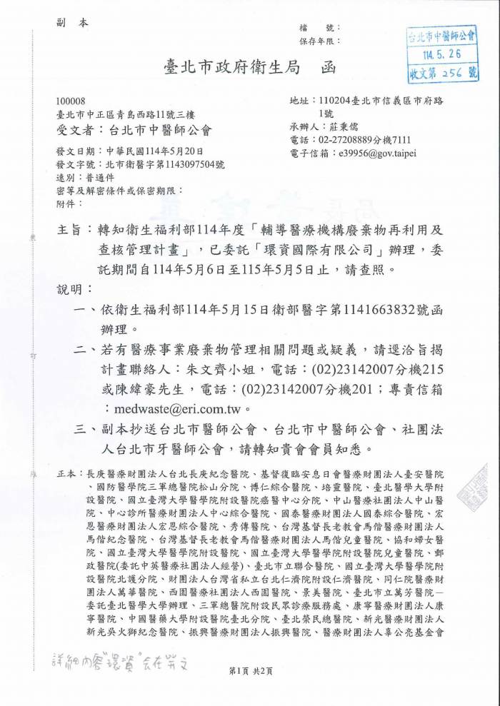 | 台北市中醫師公會 官網:http://www.tpcma.org.tw 地址:台北市中正區青島西路11號3樓 E-mail:tp.cma@msa.hinet.net 電話:(02)2314-3456(代表號) 傳真:(02)2314-8181 |