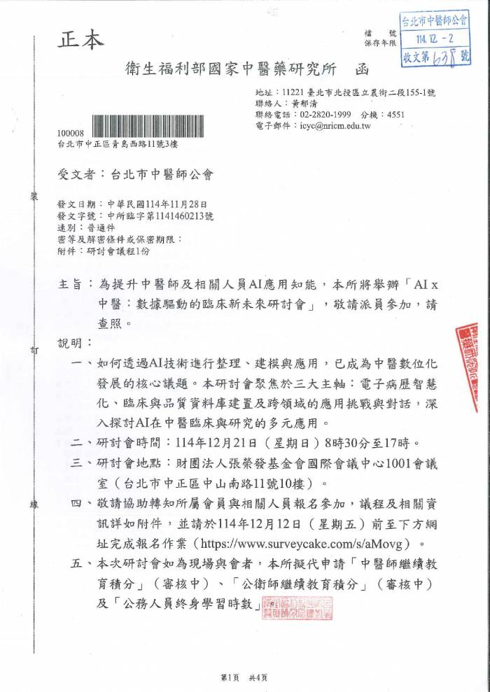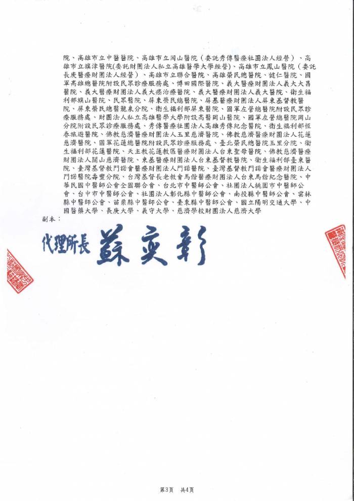 | 台北市中醫師公會 官網:http://www.tpcma.org.tw 地址:台北市中正區青島西路11號3樓 E-mail:tp.cma@msa.hinet.net 電話:(02)2314-3456(代表號) 傳真:(02)2314-8181 |