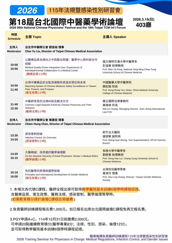 | 台北市中醫師公會 官網:http://www.tpcma.org.tw 地址:台北市中正區青島西路11號3樓 E-mail:tp.cma@msa.hinet.net 電話:(02)2314-3456(代表號) 傳真:(02)2314-8181 |