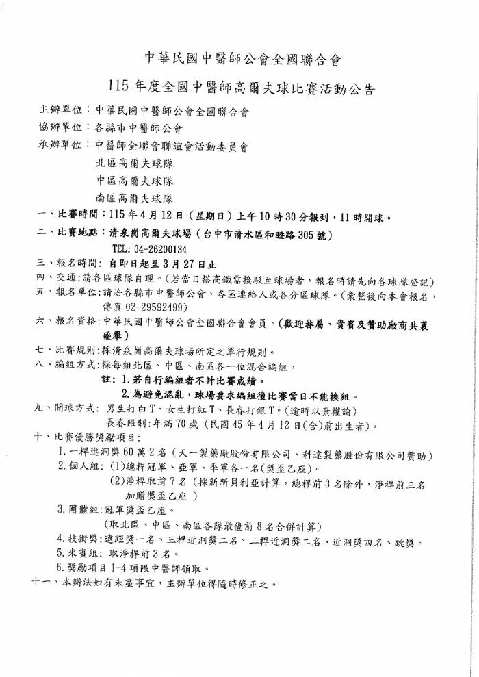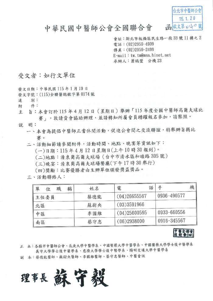 | 台北市中醫師公會 官網:http://www.tpcma.org.tw 地址:台北市中正區青島西路11號3樓 E-mail:tp.cma@msa.hinet.net 電話:(02)2314-3456(代表號) 傳真:(02)2314-8181 |