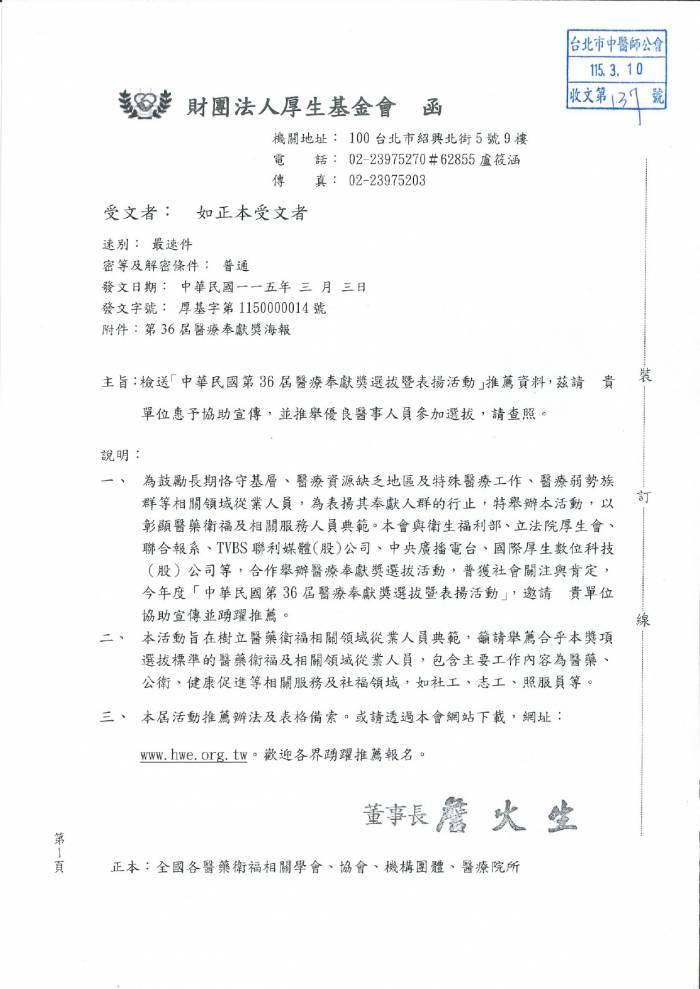 | 台北市中醫師公會 官網:http://www.tpcma.org.tw 地址:台北市中正區青島西路11號3樓 E-mail:tp.cma@msa.hinet.net 電話:(02)2314-3456(代表號) 傳真:(02)2314-8181 |