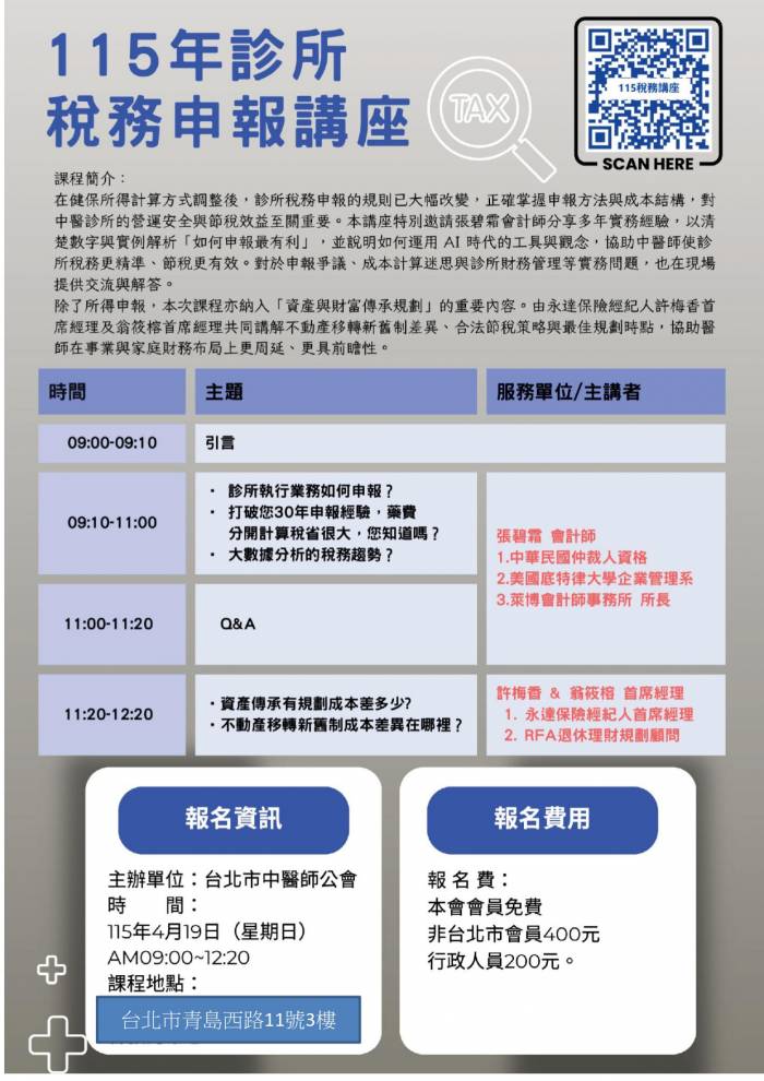 | 台北市中醫師公會 官網:http://www.tpcma.org.tw 地址:台北市中正區青島西路11號3樓 E-mail:tp.cma@msa.hinet.net 電話:(02)2314-3456(代表號) 傳真:(02)2314-8181 |