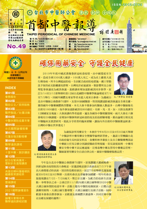 | 台北市中醫師公會 官網:http://www.tpcma.org.tw 地址:台北市中正區青島西路11號3樓 E-mail:tp.cma@msa.hinet.net 電話:(02)2314-3456(代表號) 傳真:(02)2314-8181 |