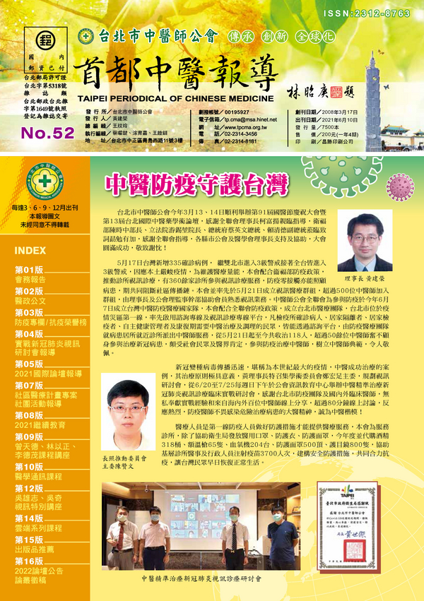 | 台北市中醫師公會 官網:http://www.tpcma.org.tw 地址:台北市中正區青島西路11號3樓 E-mail:tp.cma@msa.hinet.net 電話:(02)2314-3456(代表號) 傳真:(02)2314-8181 |