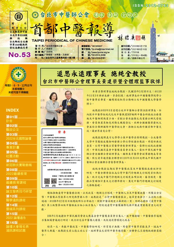 | 台北市中醫師公會 官網:http://www.tpcma.org.tw 地址:台北市中正區青島西路11號3樓 E-mail:tp.cma@msa.hinet.net 電話:(02)2314-3456(代表號) 傳真:(02)2314-8181 |