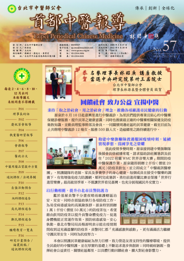 | 台北市中醫師公會 官網:http://www.tpcma.org.tw 地址:台北市中正區青島西路11號3樓 E-mail:tp.cma@msa.hinet.net 電話:(02)2314-3456(代表號) 傳真:(02)2314-8181 |
