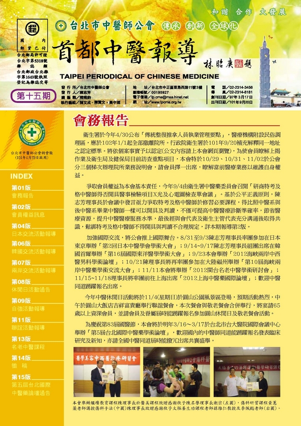 | 台北市中醫師公會 官網:http://www.tpcma.org.tw 地址:台北市中正區青島西路11號3樓 E-mail:tp.cma@msa.hinet.net 電話:(02)2314-3456(代表號) 傳真:(02)2314-8181 |