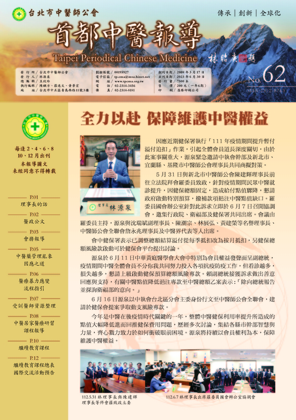| 台北市中醫師公會 官網:http://www.tpcma.org.tw 地址:台北市中正區青島西路11號3樓 E-mail:tp.cma@msa.hinet.net 電話:(02)2314-3456(代表號) 傳真:(02)2314-8181 |