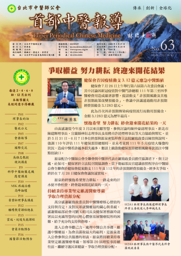 | 台北市中醫師公會 官網:http://www.tpcma.org.tw 地址:台北市中正區青島西路11號3樓 E-mail:tp.cma@msa.hinet.net 電話:(02)2314-3456(代表號) 傳真:(02)2314-8181 |
