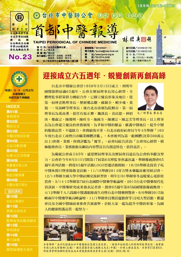 | 台北市中醫師公會 官網:http://www.tpcma.org.tw 地址:台北市中正區青島西路11號3樓 E-mail:tp.cma@msa.hinet.net 電話:(02)2314-3456(代表號) 傳真:(02)2314-8181 |
