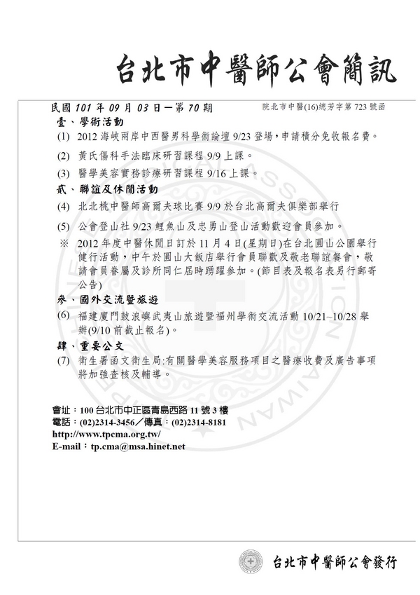 | 台北市中醫師公會 官網:http://www.tpcma.org.tw 地址:台北市中正區青島西路11號3樓 E-mail:tp.cma@msa.hinet.net 電話:(02)2314-3456(代表號) 傳真:(02)2314-8181 |