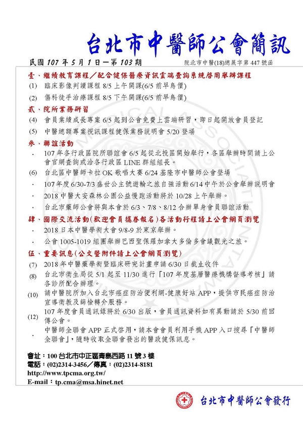 | 台北市中醫師公會 官網:http://www.tpcma.org.tw 地址:台北市中正區青島西路11號3樓 E-mail:tp.cma@msa.hinet.net 電話:(02)2314-3456(代表號) 傳真:(02)2314-8181 |