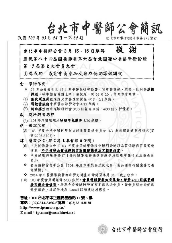 | 台北市中醫師公會 官網:http://www.tpcma.org.tw 地址:台北市中正區青島西路11號3樓 E-mail:tp.cma@msa.hinet.net 電話:(02)2314-3456(代表號) 傳真:(02)2314-8181 |
