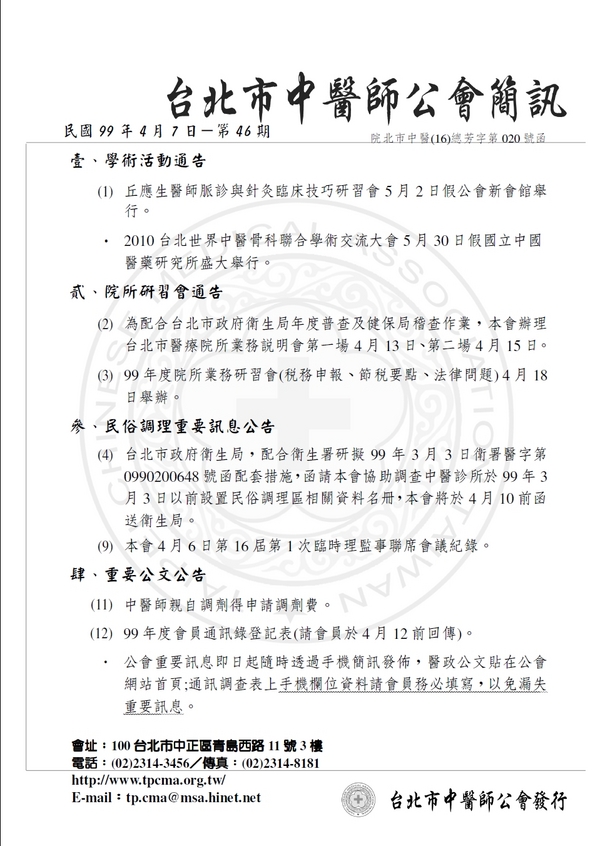 | 台北市中醫師公會 官網:http://www.tpcma.org.tw 地址:台北市中正區青島西路11號3樓 E-mail:tp.cma@msa.hinet.net 電話:(02)2314-3456(代表號) 傳真:(02)2314-8181 |