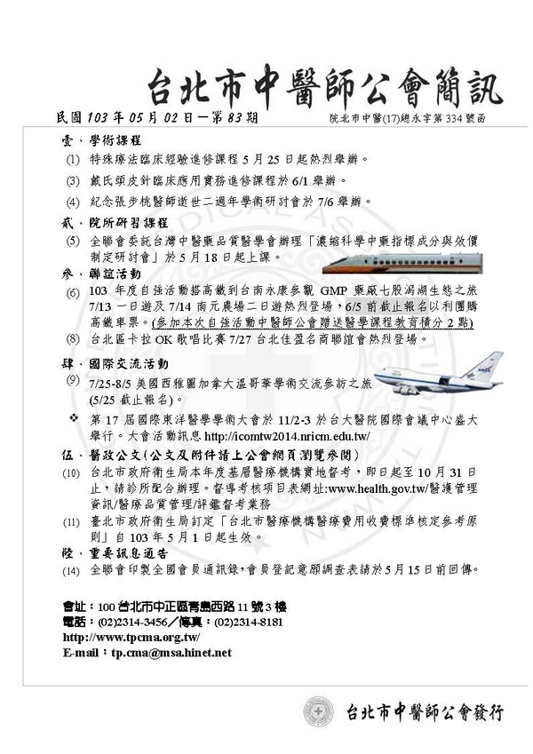| 台北市中醫師公會 官網:http://www.tpcma.org.tw 地址:台北市中正區青島西路11號3樓 E-mail:tp.cma@msa.hinet.net 電話:(02)2314-3456(代表號) 傳真:(02)2314-8181 |