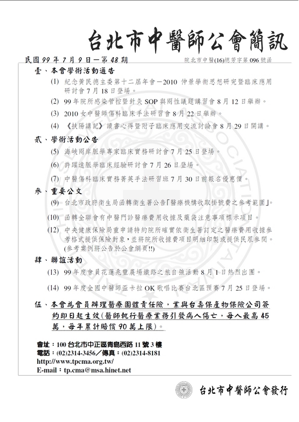 | 台北市中醫師公會 官網:http://www.tpcma.org.tw 地址:台北市中正區青島西路11號3樓 E-mail:tp.cma@msa.hinet.net 電話:(02)2314-3456(代表號) 傳真:(02)2314-8181 |