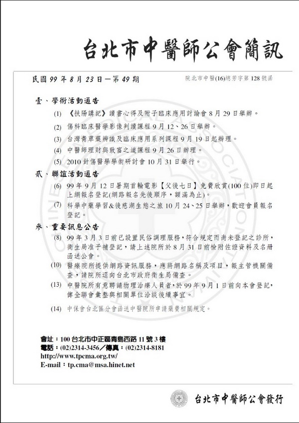 | 台北市中醫師公會 官網:http://www.tpcma.org.tw 地址:台北市中正區青島西路11號3樓 E-mail:tp.cma@msa.hinet.net 電話:(02)2314-3456(代表號) 傳真:(02)2314-8181 |