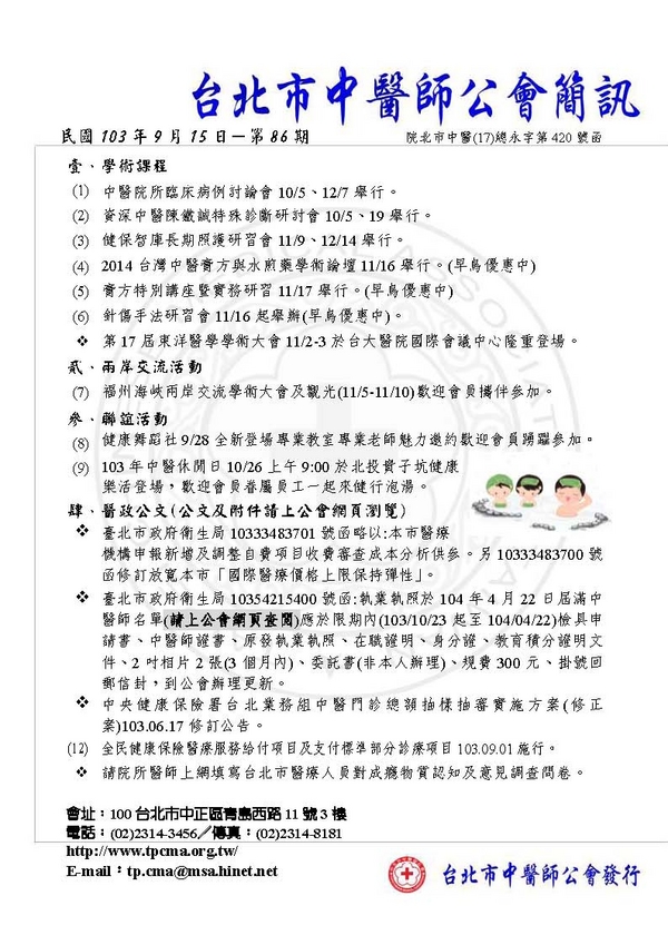 | 台北市中醫師公會 官網:http://www.tpcma.org.tw 地址:台北市中正區青島西路11號3樓 E-mail:tp.cma@msa.hinet.net 電話:(02)2314-3456(代表號) 傳真:(02)2314-8181 |