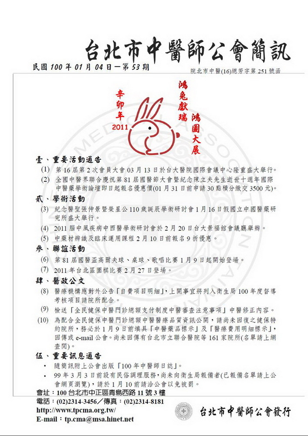 | 台北市中醫師公會 官網:http://www.tpcma.org.tw 地址:台北市中正區青島西路11號3樓 E-mail:tp.cma@msa.hinet.net 電話:(02)2314-3456(代表號) 傳真:(02)2314-8181 |