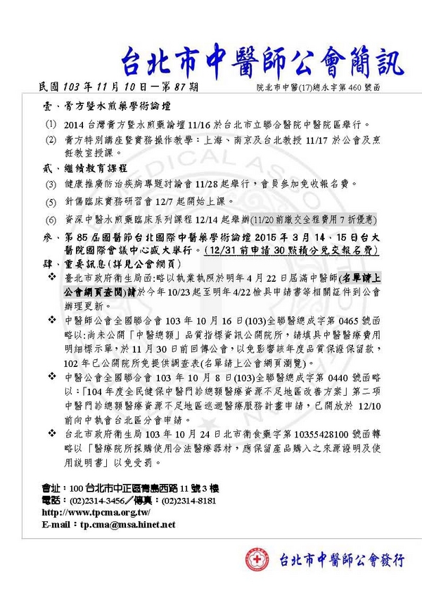 | 台北市中醫師公會 官網:http://www.tpcma.org.tw 地址:台北市中正區青島西路11號3樓 E-mail:tp.cma@msa.hinet.net 電話:(02)2314-3456(代表號) 傳真:(02)2314-8181 |