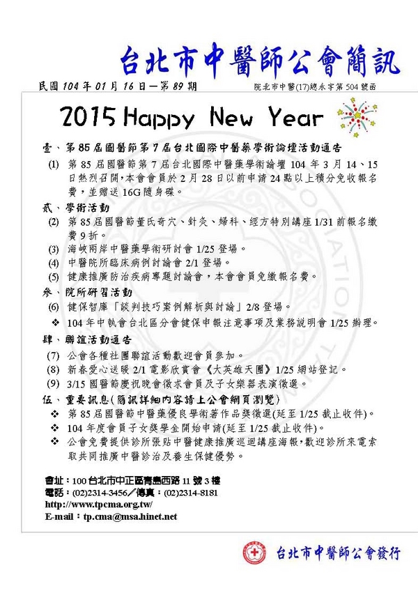 | 台北市中醫師公會 官網:http://www.tpcma.org.tw 地址:台北市中正區青島西路11號3樓 E-mail:tp.cma@msa.hinet.net 電話:(02)2314-3456(代表號) 傳真:(02)2314-8181 |