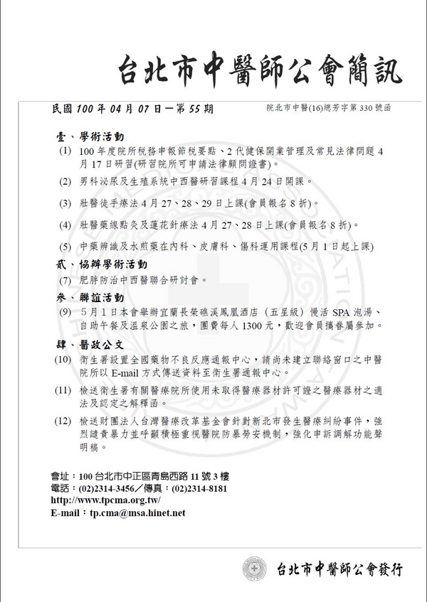 | 台北市中醫師公會 官網:http://www.tpcma.org.tw 地址:台北市中正區青島西路11號3樓 E-mail:tp.cma@msa.hinet.net 電話:(02)2314-3456(代表號) 傳真:(02)2314-8181 |