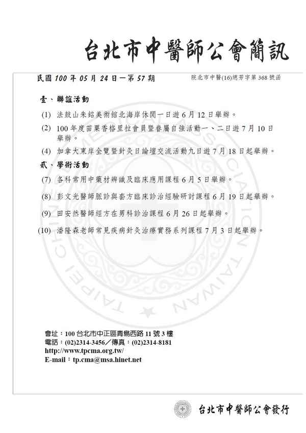 | 台北市中醫師公會 官網:http://www.tpcma.org.tw 地址:台北市中正區青島西路11號3樓 E-mail:tp.cma@msa.hinet.net 電話:(02)2314-3456(代表號) 傳真:(02)2314-8181 |