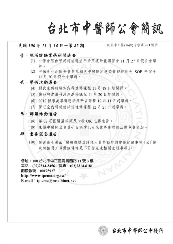 | 台北市中醫師公會 官網:http://www.tpcma.org.tw 地址:台北市中正區青島西路11號3樓 E-mail:tp.cma@msa.hinet.net 電話:(02)2314-3456(代表號) 傳真:(02)2314-8181 |